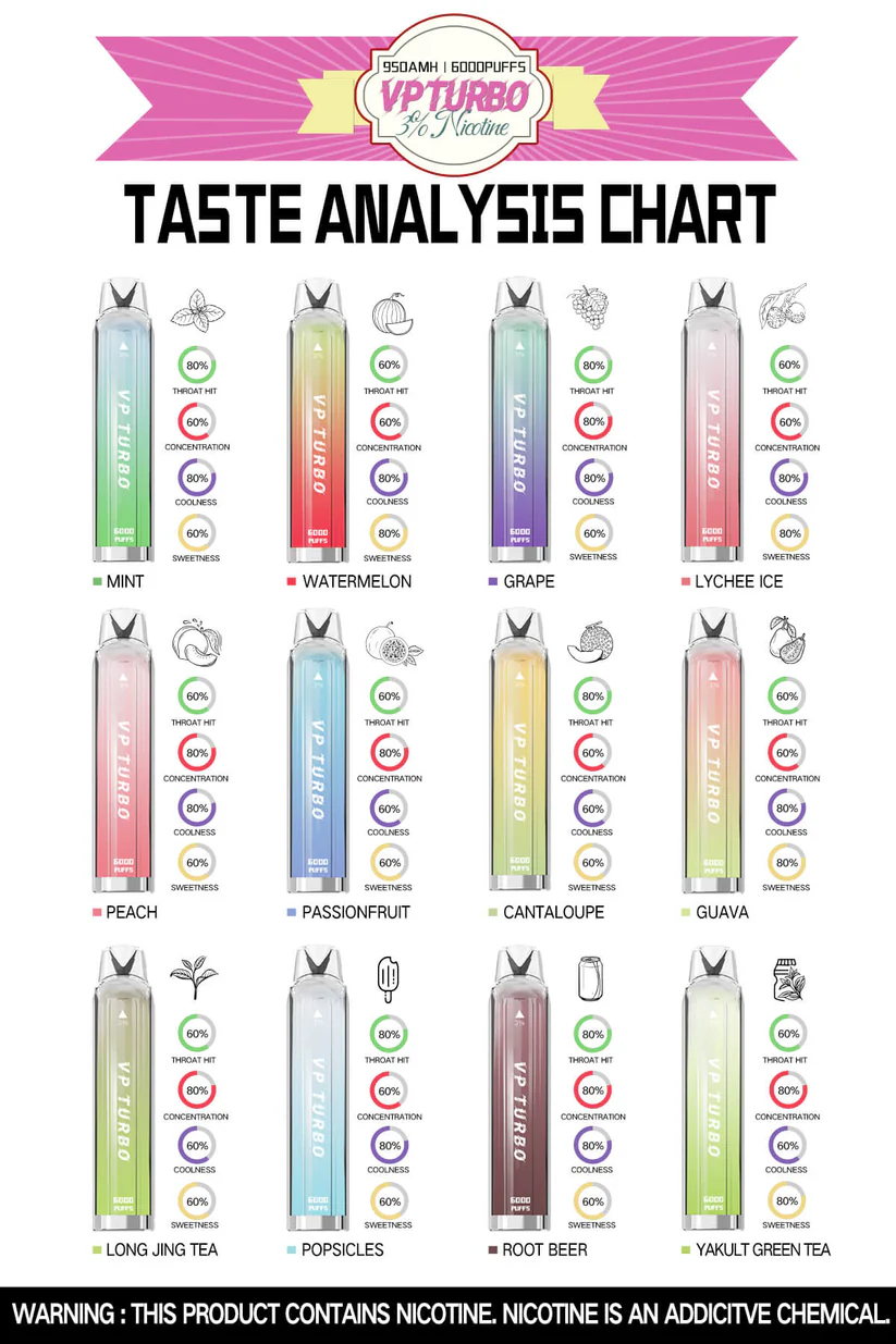 高容量,長續航:VP TURBO 6000搭載950mAh電池與10ml預裝煙油,提供高達6000口的穩定輸出,滿足長時間使用需求,無需頻繁更換。
